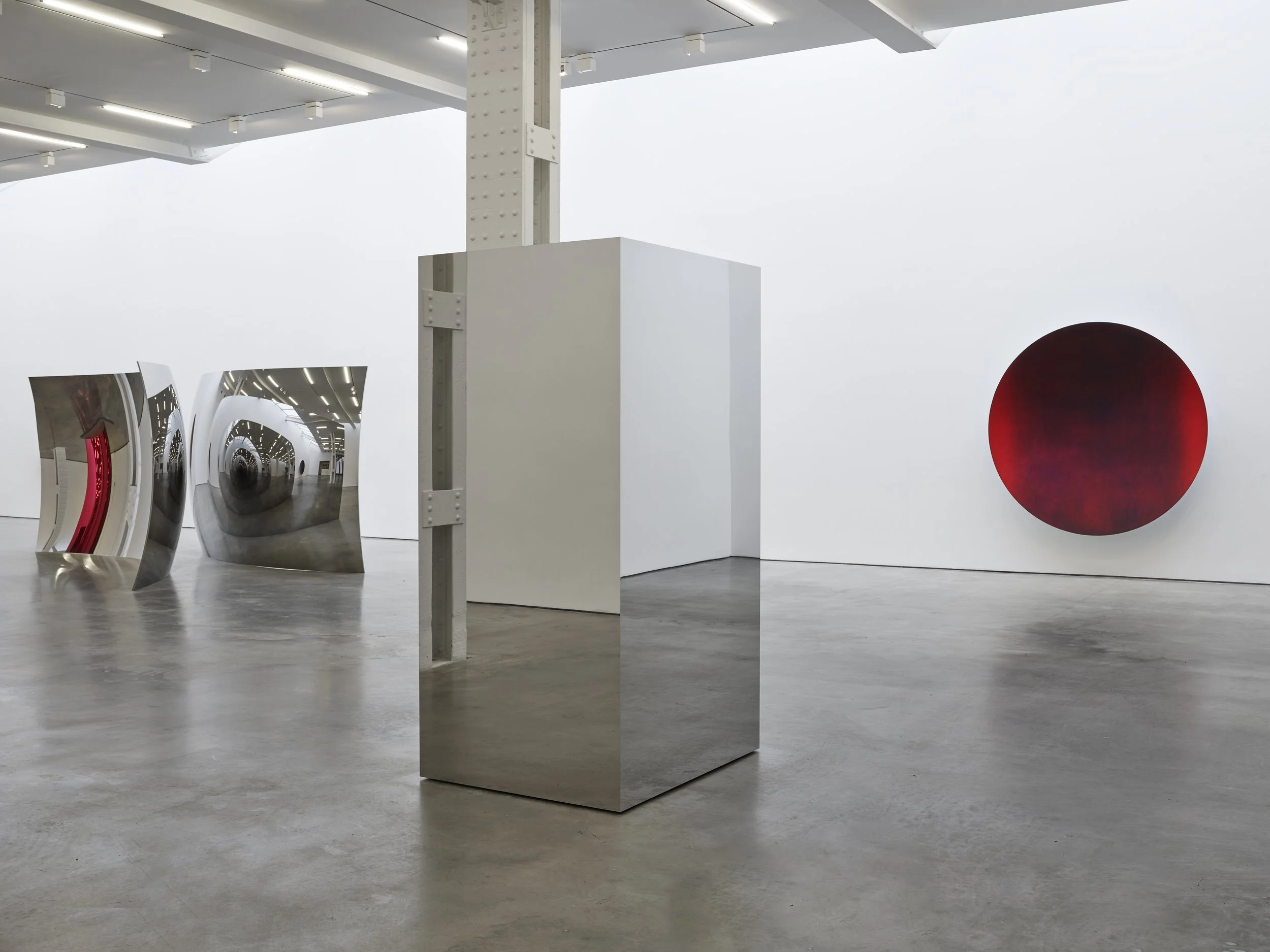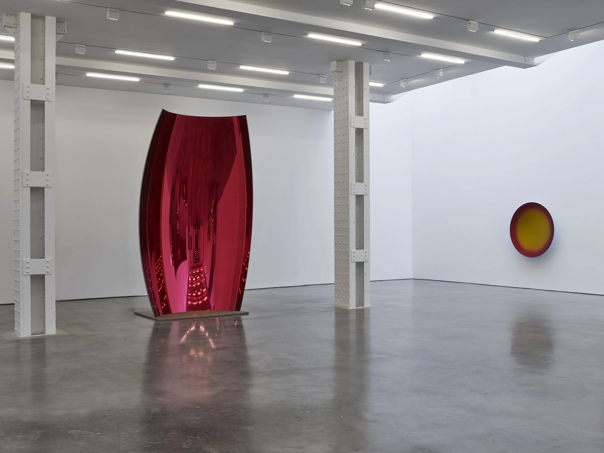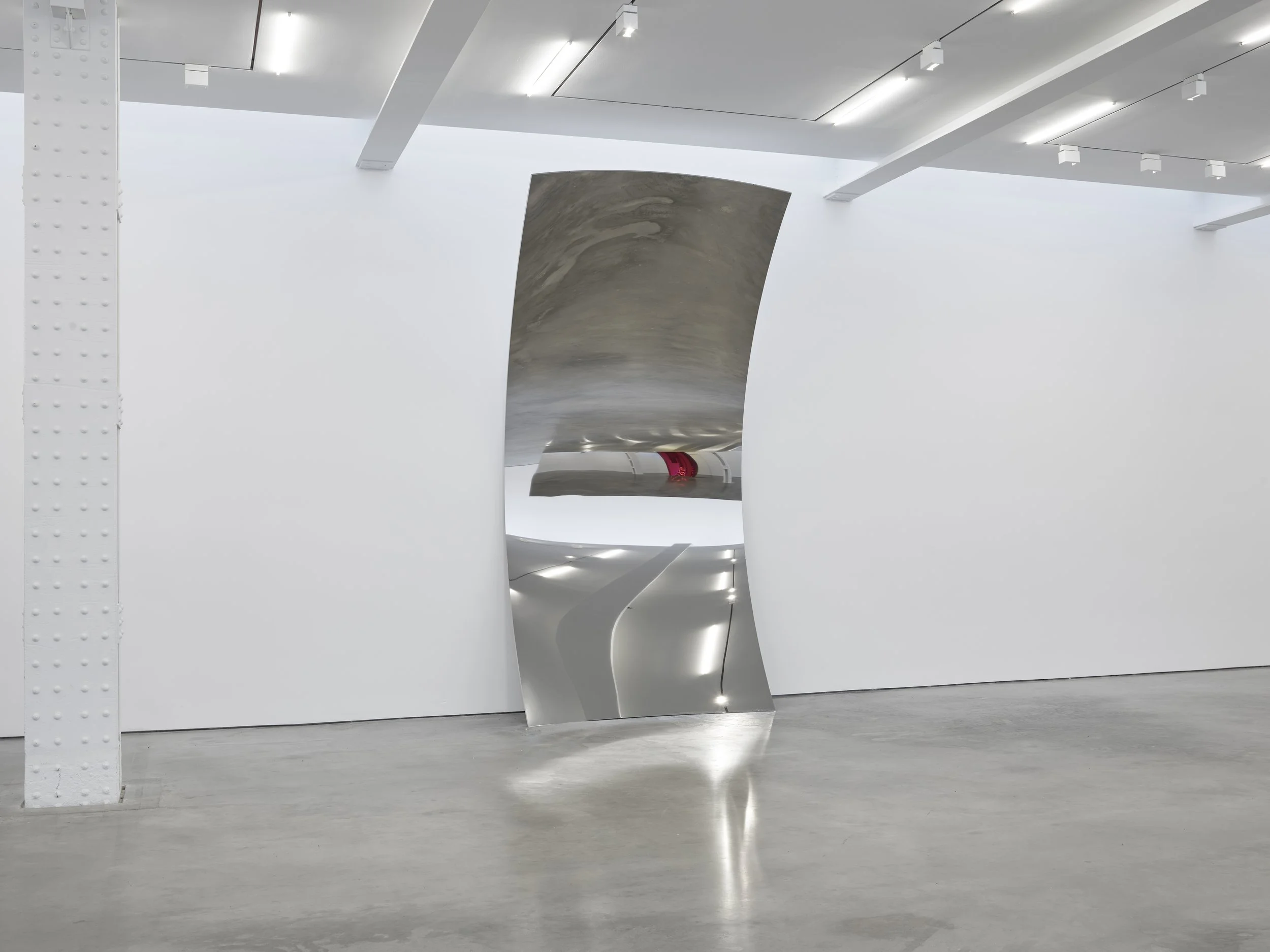 The exhibition revolves around three formal archetypes: first, the unfailingly lucent mirrors that enact a cinematic simulacrum of the room; second, the concave discs that insinuate our visual faculties; and third, the monumental, lacquered interior surface of Stave (Red) (2015) that mirrors the optical instability of the steel through pigments. Upon this towering ovular form, the concave interior generates a chromatic iridescence—the luminous ceiling grid somberly reflected upside down, in shades of silver, burgundy, and pink dissolving into one another with every shift of our vantage point. Along with this iridescence, a spatial dialogue emerges between the freestanding mass of Stave (Red) and the C-shaped curve of Non-Object (Plane) (2010). This frontally concave and soaring plane, tangent to the wall, hovers between freestanding sculpture and relief—its verticality providing a corporeal surrogate for the spectator's own presence. Whereas the freestanding and leaning sculptures counterpoise human postures—erect, leaning, surrendered—the pair of incurved lenses attached to the wall incarnates vision itself, incorporating the somatic and sensory realities of the body’s optical members into the gallery's own anatomy: the architecture thus maps itself to a body that stands, reclines, slumbers, and attempts to outstare.
