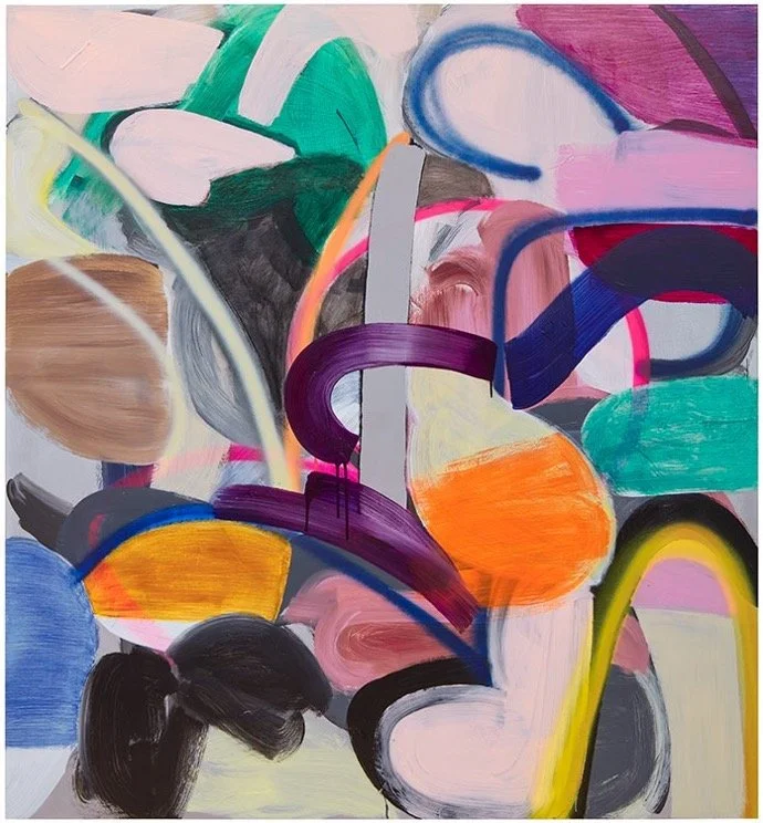 Curved bands and accumulated layers of acrylic evoke choreographic movements of unidentifiable forms within an exterior world awash in light. Yet at the same time, Tomasko taps into the interior world of the body with her diaphanous brushmarks and spray-painted curls, recalling the mechanism of the mind and our sensory experiences. When shifting our attention from the external world to the internal realm of the body, Tomasko’s dynamic shapes and resplendent colors arrestingly register as correlates of visual perception, where chains of electrical signals are transmitted from the surface of the retina to the cerebral cortex through the optic nerve. These painterly explorations of Tomasko lure the onlooker to grasp those moments of awareness that instill vast gaps between semblance and abstraction, along with those moments of awareness when vision and abstraction manifest themselves as entwinements.