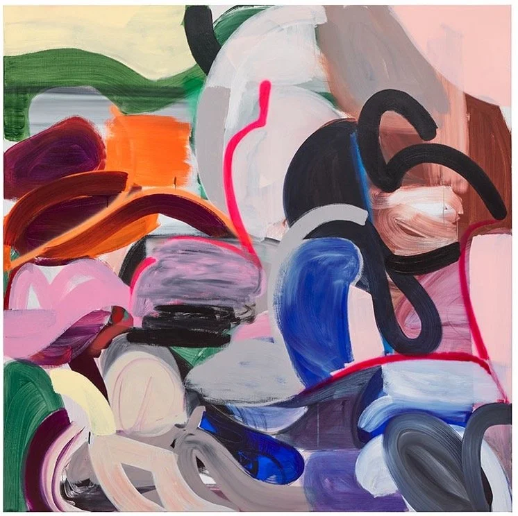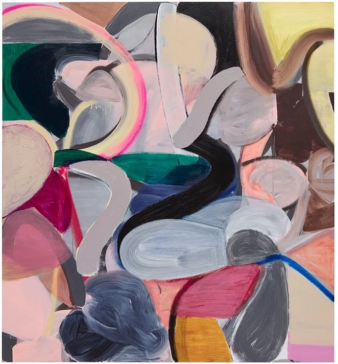 Predominated by muted shades of pink in conversation with vibrant and subdued colors, Tomasko’s medium-scale painting Shapeshifter (lost in a dream) displays opaque and sheer brushmarks that give rise to fragmented elliptical and spherical forms intermingled with winding bands. At times unmodulated and flat, at times wondrously illusory, serpentine stripes enact engaging counterparts of the brushstroke’s everchanging modalities. On the lower left, swirling strokes in dark shades of bluish-grey convey signs of chiaroscuro, a method that is reiterated in shades of cream and brown in the upper right corner of the pictorial space. Conversely, two opaque ribbons in taupe are displayed on the middle left and the upper right. Viridian billows extend vaporously from the upper left corner toward the center, overlapping ultramarine strokes that are partly concealed underneath a charcoal black curl. Whereas flowing blues and greens here conjure up chimerical landscapes, unbridled brushstrokes in pinks and greys give way to undertones of sensuous bodies in twirling motion. Strikingly, the painting comes across as an encapsulation of the endlessly shifting evanescence of dreams. As Tomasko has explained, “I am always trying to bridge the divide between sleep time and daytime, to establish a relationship between the two, and to bring them closer somehow.” [7]