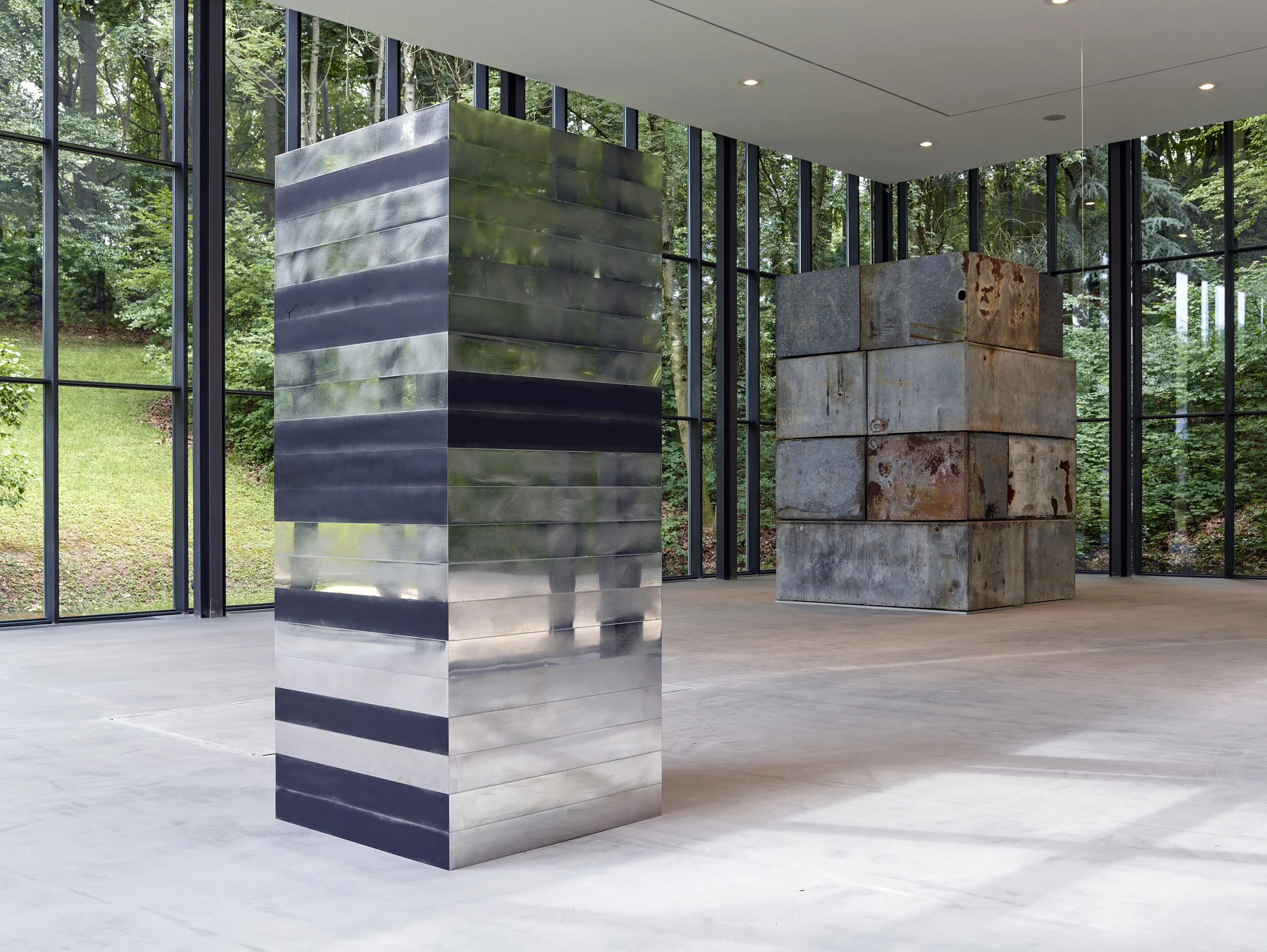 Sean Scully, Landline Cubed, 2015-2020. Stainless steel and acrylic, 274.3 by 91.4 by 91.4 cm (9 by 3 by 3 feet). Photo by Michael Richter. Courtesy of the artist and Villa Waldfrieden, Waldfrieden Sculpture Park, Wuppertal, Germany.